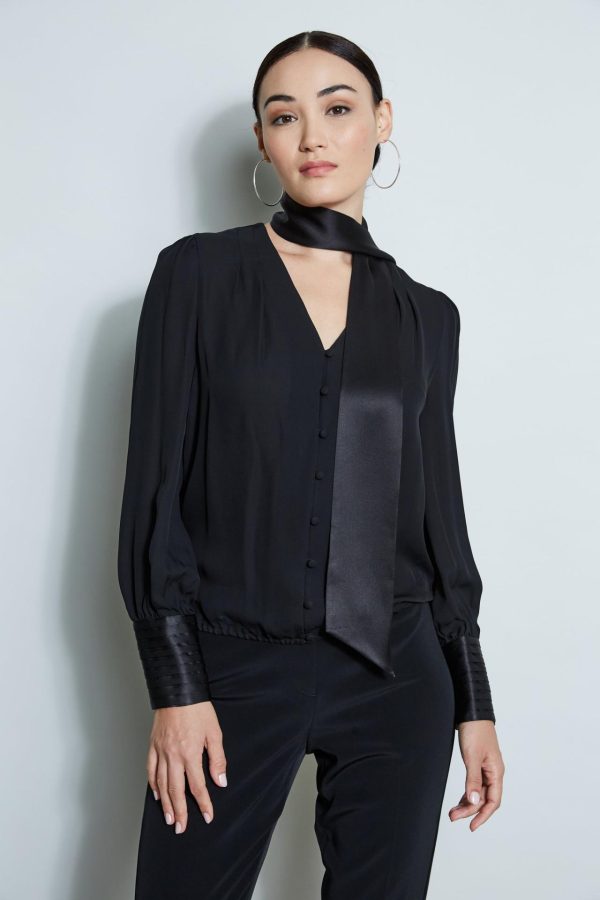 - Silk Georgette Long Sleeve Button Front V-Neck Shirt with pleated cuffs & Satin Neck Tie.