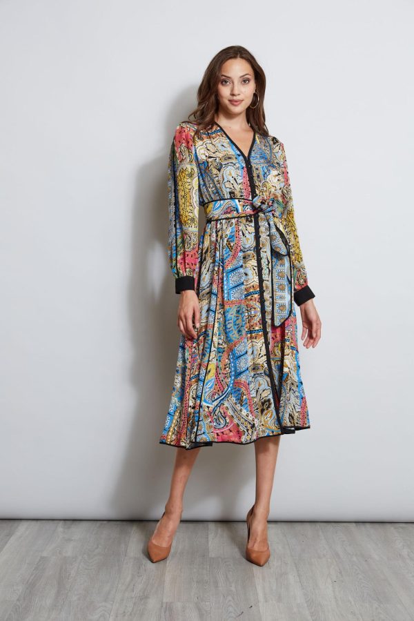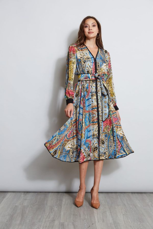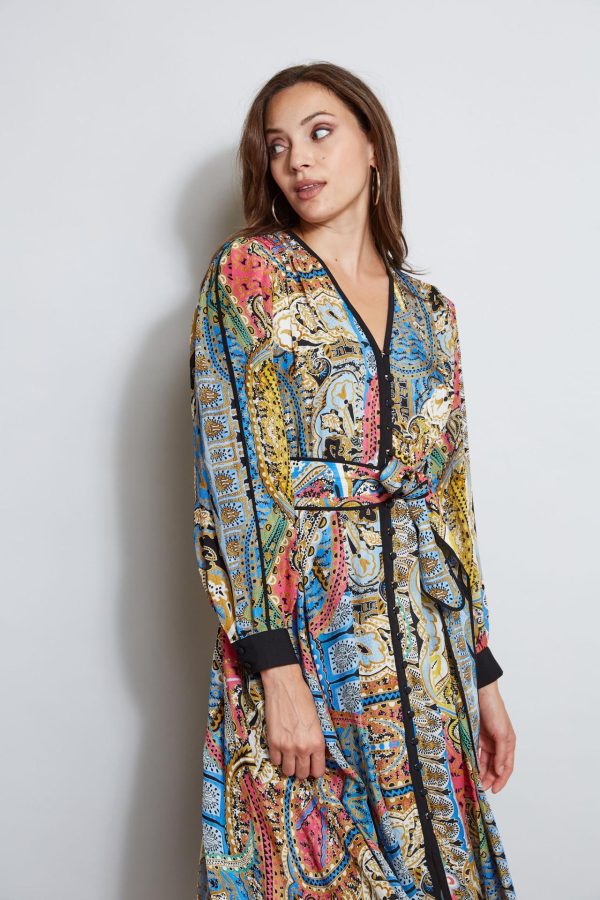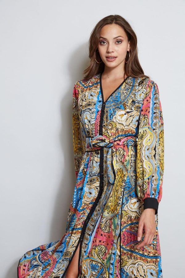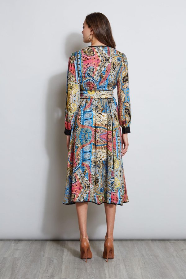 Our Boho inspired Calypso Paisley Print in soft Georgette is perfect for those transitional cold weather days. Designed with contrasting trim & cuffs, the self-sash at the waist emphasizes your shape while the blouson sleeves lend a femme vibe to this on-trend midi dress.