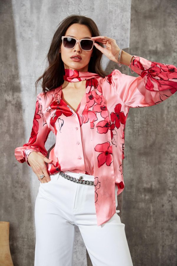 - Silk Satin Floral Printed Shirt With Removable Neck Tie