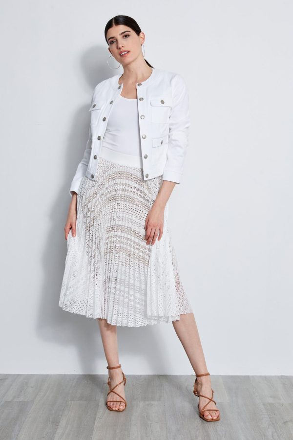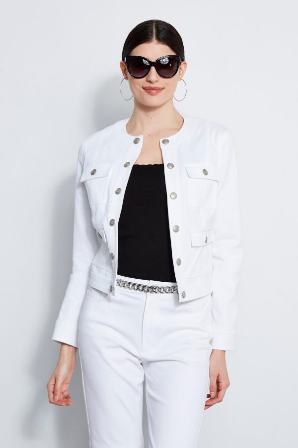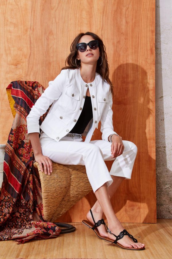 This is your next must-have jacket. White Stretch Cotton Twill gives our Denim Jacket the casual chic factor, while the crested matte silver buttons make it edgy. Wear it with its matching cropped jean or dress it up with our laser cut pleated skirt.
