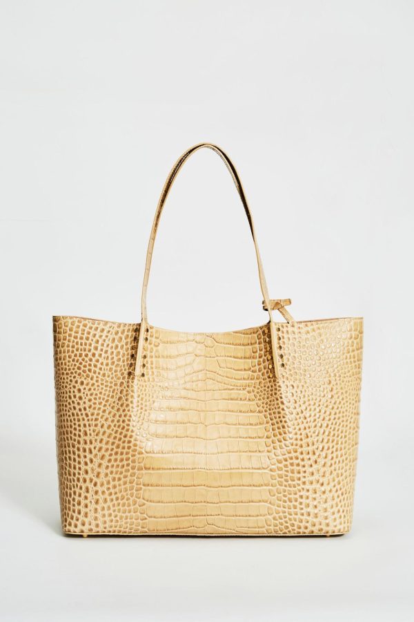 Meticulously crafted in Italy, this exclusive Tote is crafted in luxe crocodile embossed leather. The glossy patina of the leather and the subtle gold stud accents have an unmatched sophistication. Designed with a spacious interior that features a slip pocket, it is large enough to carry all your essentials. Embrace the perfect fusion of exotic elegance and timeless craftsmanship, and let this essential tote become your signature piece, making a lasting impression wherever you go.