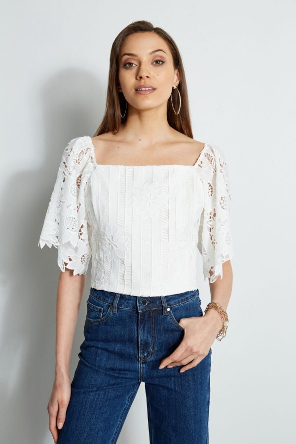 Our Floral cut out embroidered Corset is a standout. The sleeves have a delicate elastic finish at the top that allows you to wear off-shoulder or on your shoulder. Pair it with its matching romantic tiered skirt or with pants.