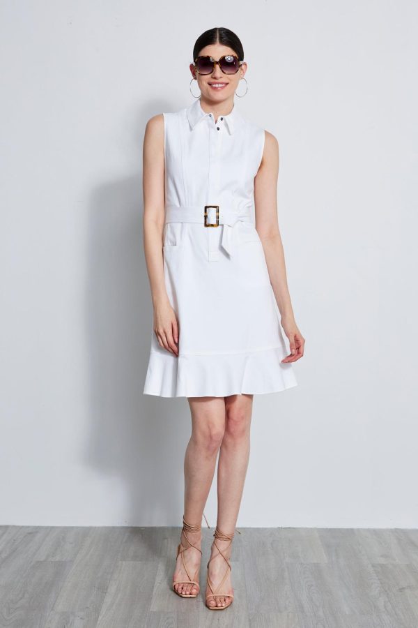 Meet our modern, Stretch Denim Dress. It’s sporty chic with its faux tortoise buckle, self sash, hidden snap closure and flirty hem flounce. Dress it up with heels or down with sneakers- effortlessly chic either way.