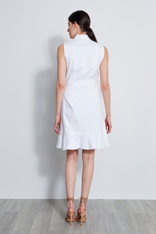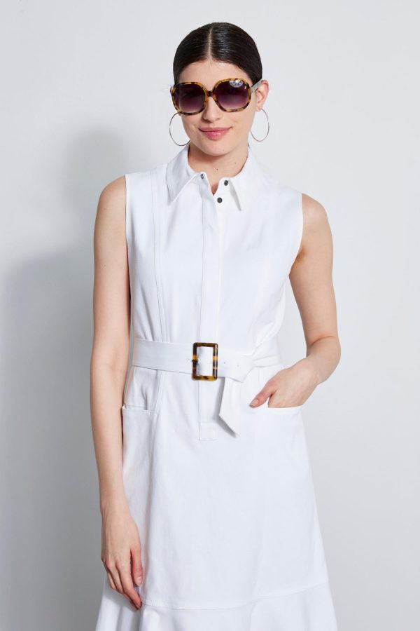 Meet our modern, Stretch Denim Dress. It’s sporty chic with its faux tortoise buckle, self sash, hidden snap closure and flirty hem flounce. Dress it up with heels or down with sneakers- effortlessly chic either way.