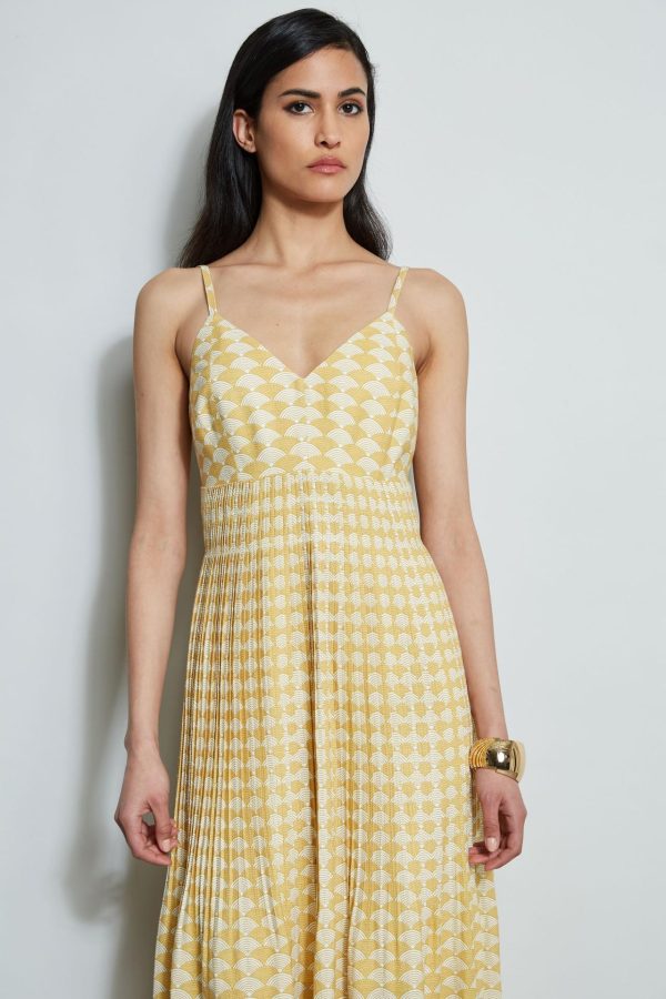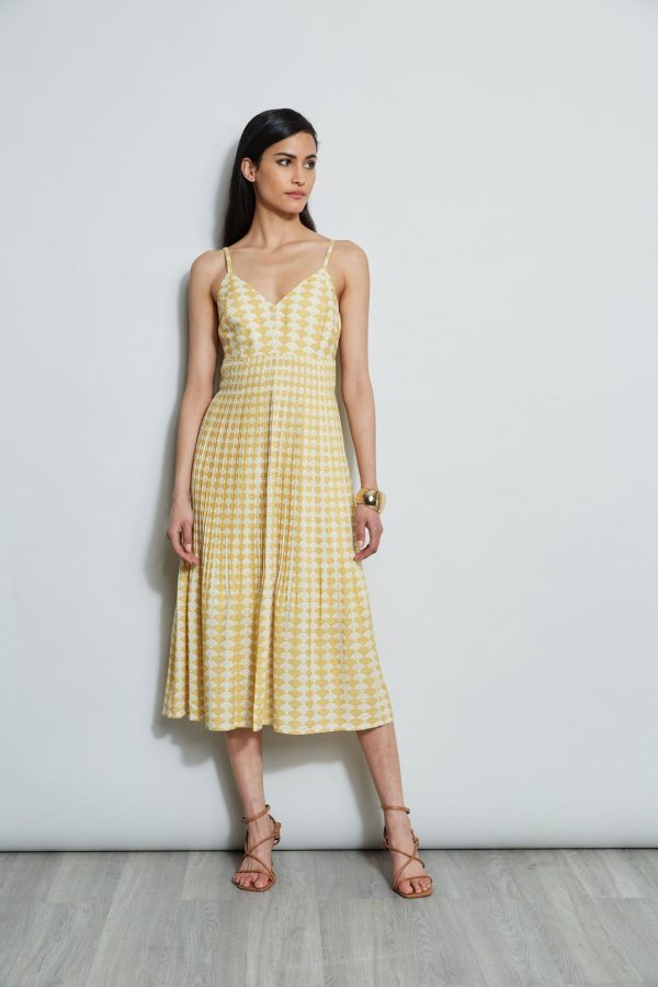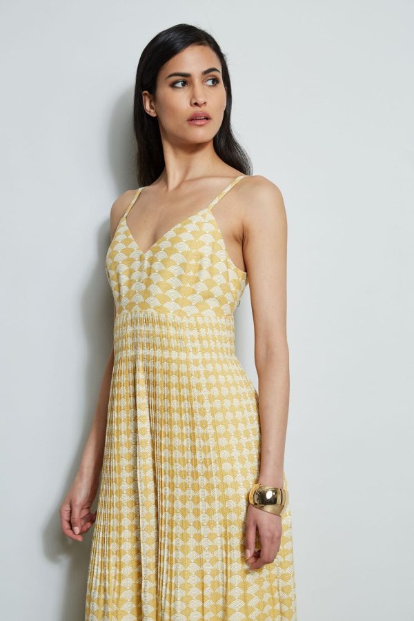 The Midi Dress is elevated with knife pleating that begins at the waist and extends to the hem. Designed in a luxe Viscose Linen blend, the Cape Diamond Arch Print brings this dress to life. This standout Pleated Midi Dress is perfect for warm summer days.