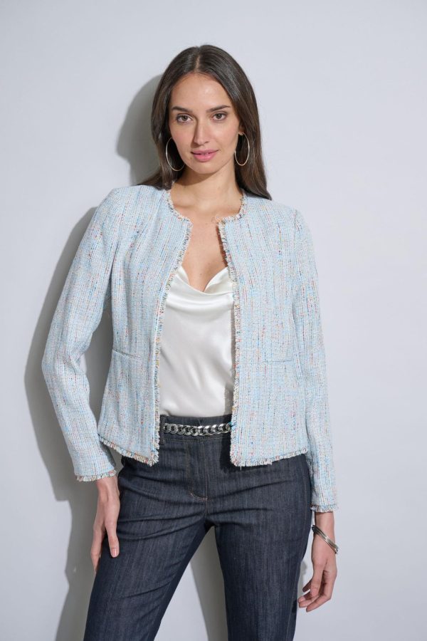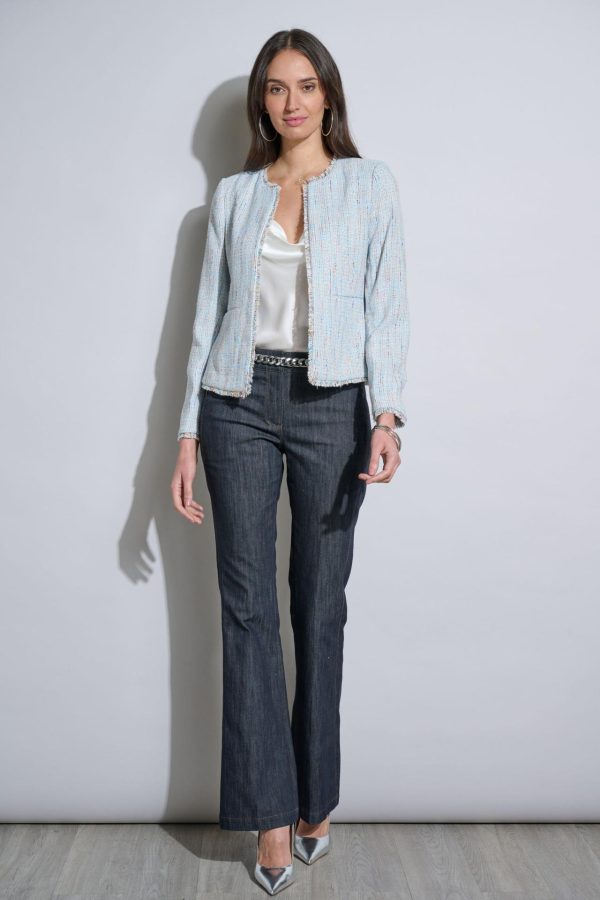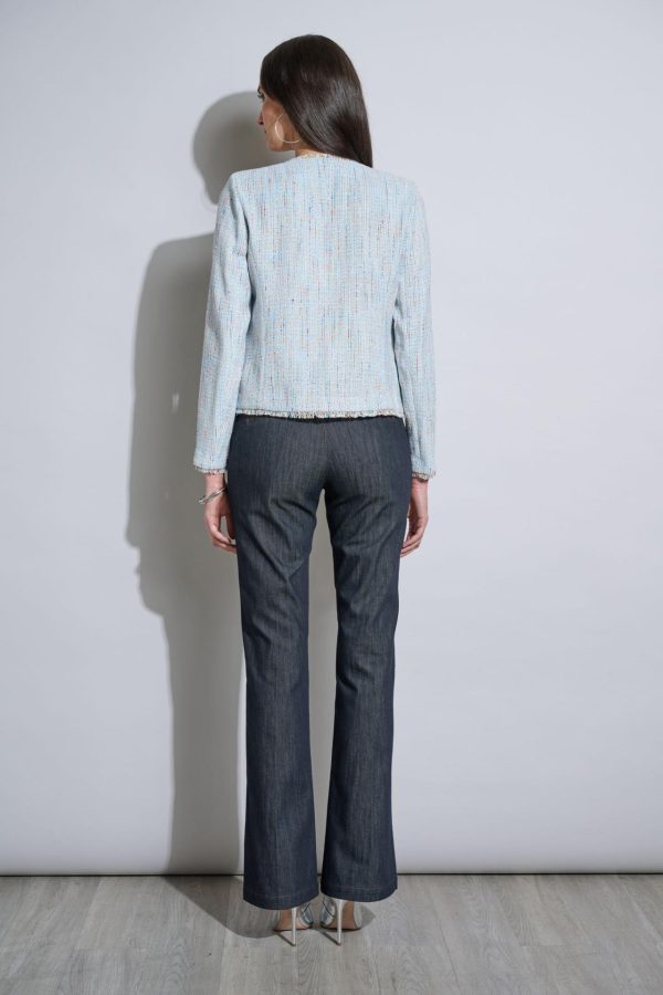 Our novelty tweed jacket has a modern vibe with its slightly cropped silhouette & fringe trim. Rich in texture, our tweed jacket features slit welt pockets & fringe trim around the neckline & cuffs. Great with white or over a dress – this jacket speaks of a new season.