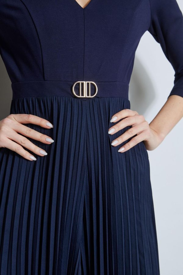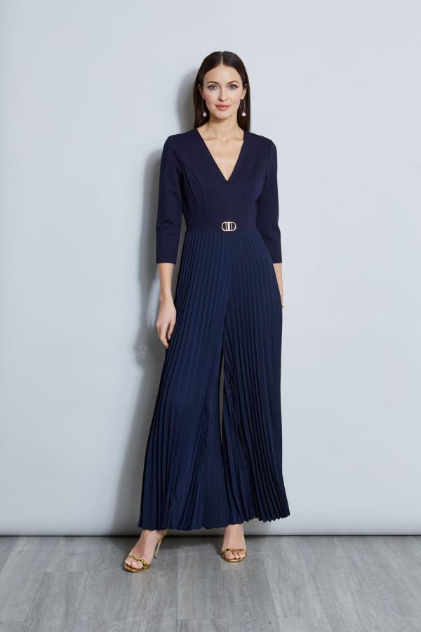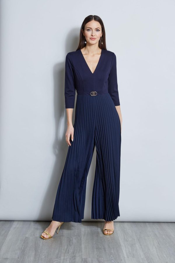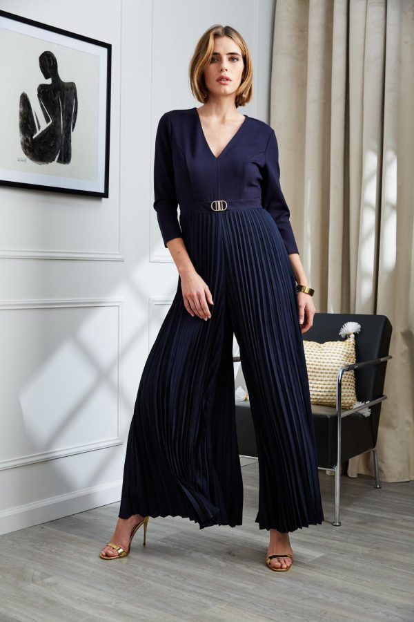 - Ponte Knit Bodice Pleated Wide Leg Jumpsuit With Belt Buckle