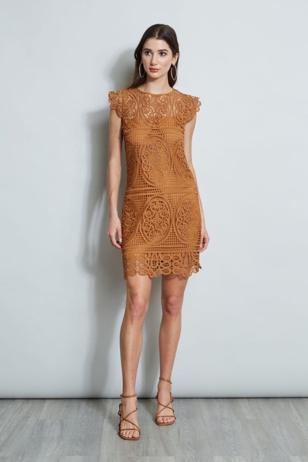 Elie Tahari Lace Flutter Sleeve Dress Caramel | Online Women Short Sleeve Dresses