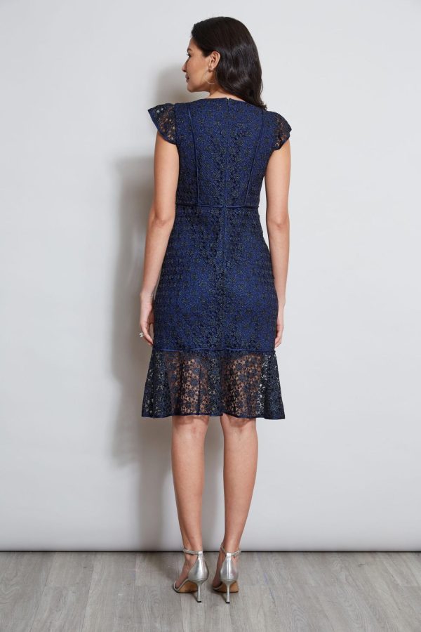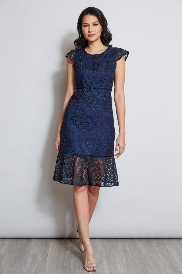 We chose a chic metallic Lace in a delicate floral design for our Cocktail Dress. The Satin lining, soft flutter sleeve and flounced hem add dimension to this sophisticated Lace Midi Dress.
