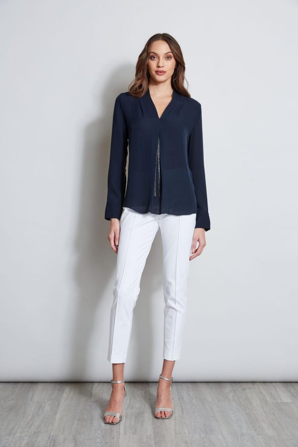 Monili Chain lends our Silk Georgette shirt a modern chic attitude. The flattering V-neck is detailed with chain trim and a delicate fringed chain. A modern staple that you’ll reach for again and again. Dress it up or down.