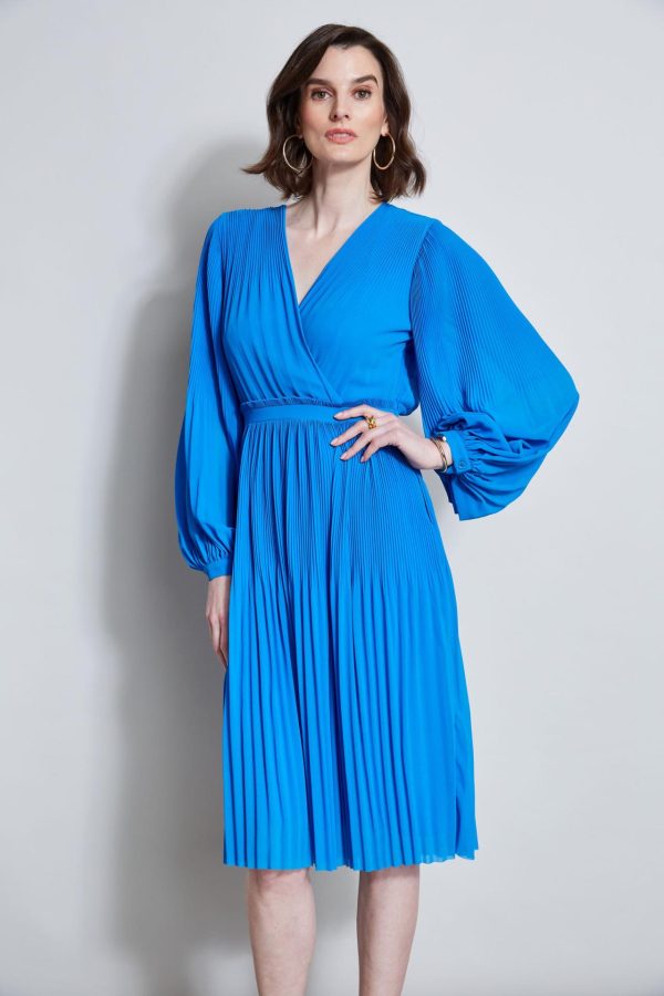 Elie Tahari Mock Wrap Pleated Dress Blue Ivy | Online Women Long Sleeve Dresses