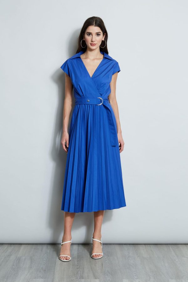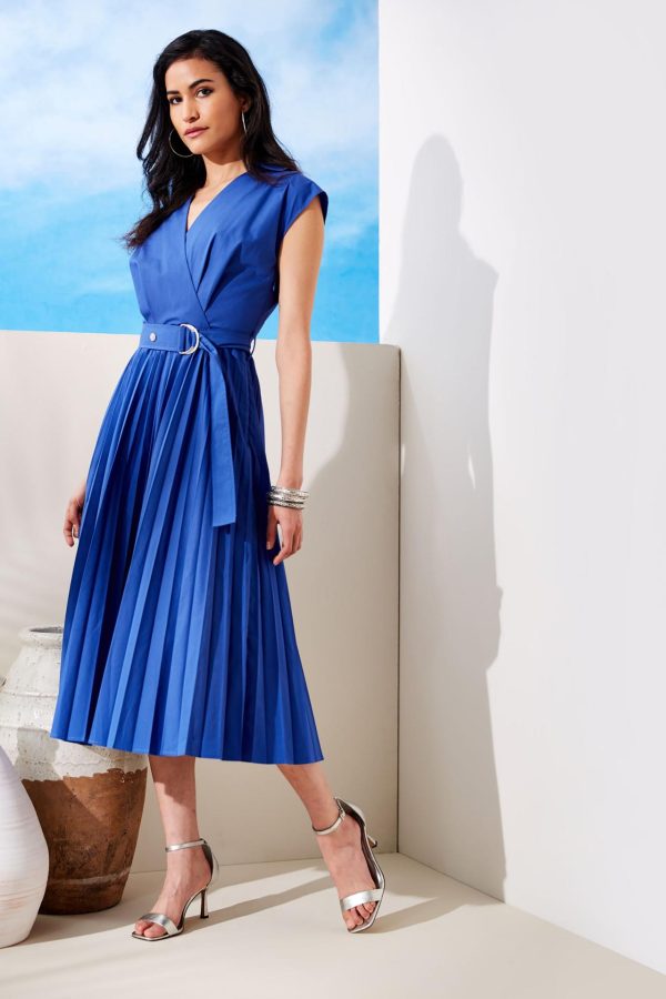 - Cotton Pleated Midi Dress with Self Belt & Faux Wrap Top