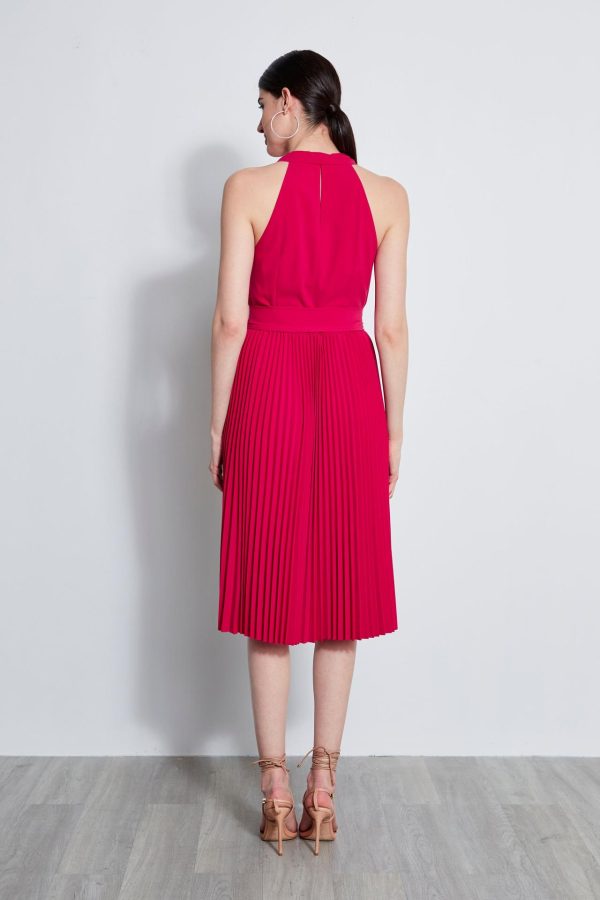 - Sleeveless Halter Midi Dress with Cowl Neckline, Self-Sash & Pleated Skirt
