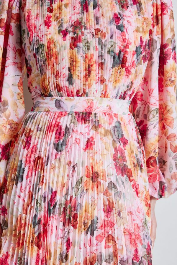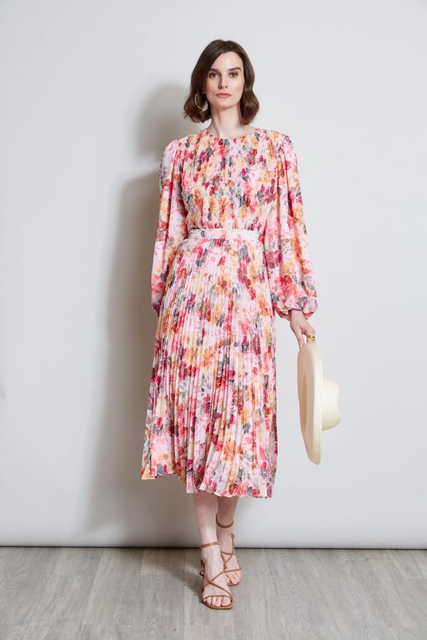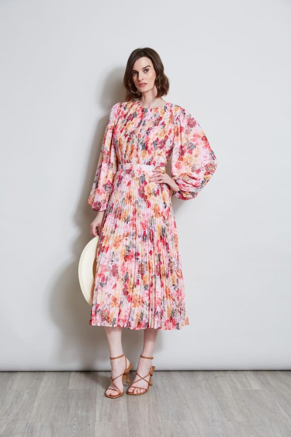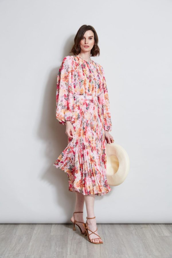 Elie Tahari Pleated Floral Midi Dress Wonderland Print | Online Women Long Sleeve Dresses
