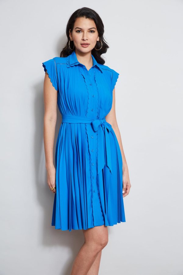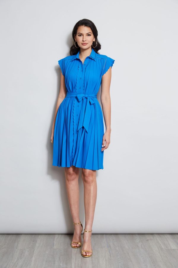 - Pleated Collared Dress with Self-Sash & Scallop Detailing