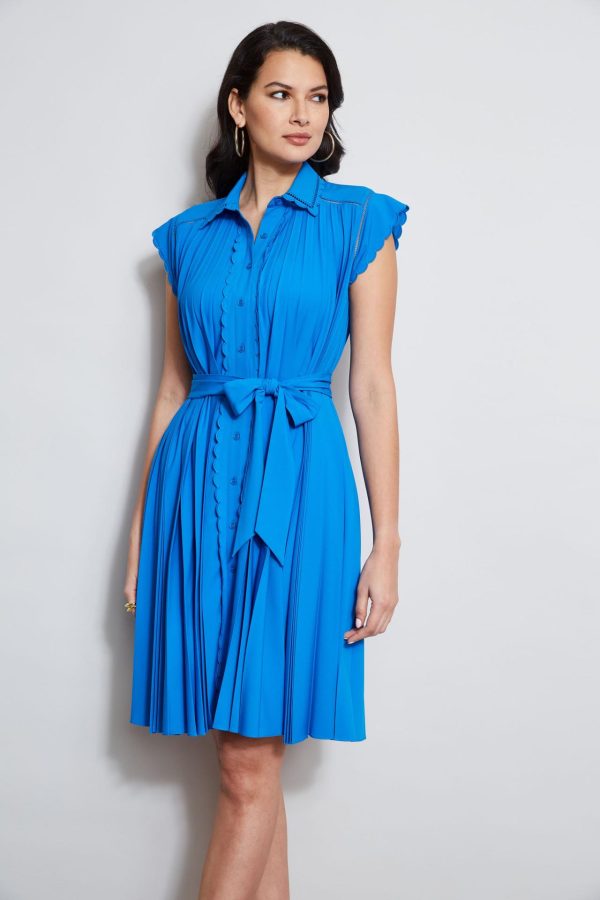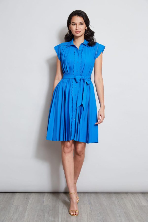 The easiest of shirt dresses in a Polyester Blend is elevated with accordion pleading that begins at the shoulder and extends to the hem. Designed with scallop edges on the sleeve, collar & placket, cinch the waist with its self-sash belt.