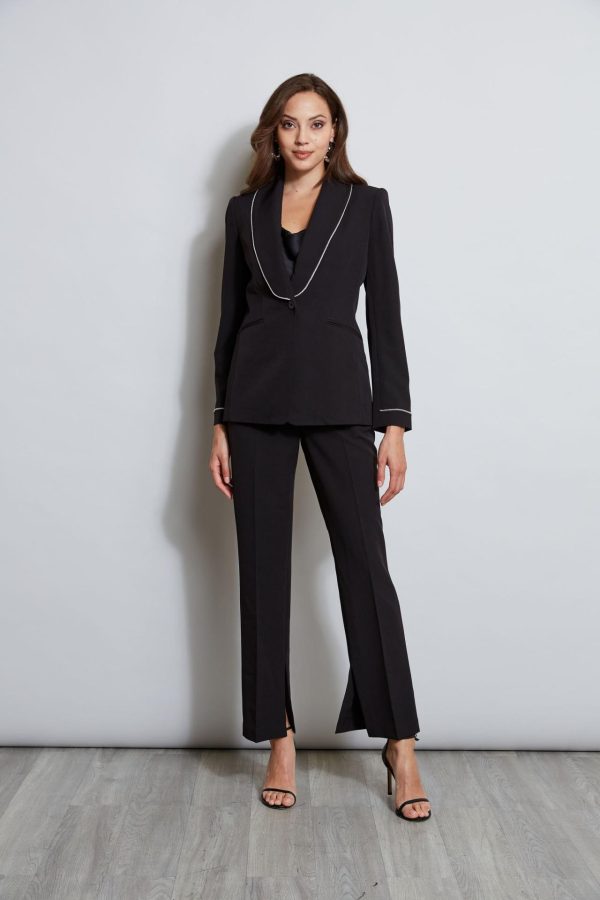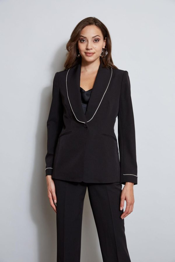 Our rhinestone edged Blazer has the designer touch. With a shawl collar & single button closure, this jacket is elevated with rhinestone trim at the collar & cuffs. Wear it casually with vegan leather or pair it with its matching pant for the seasons must have matched suit.