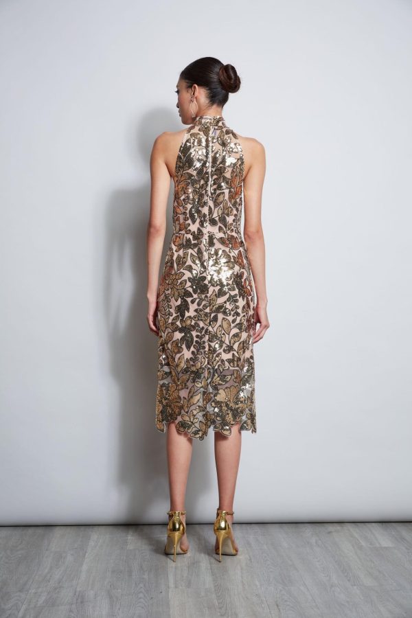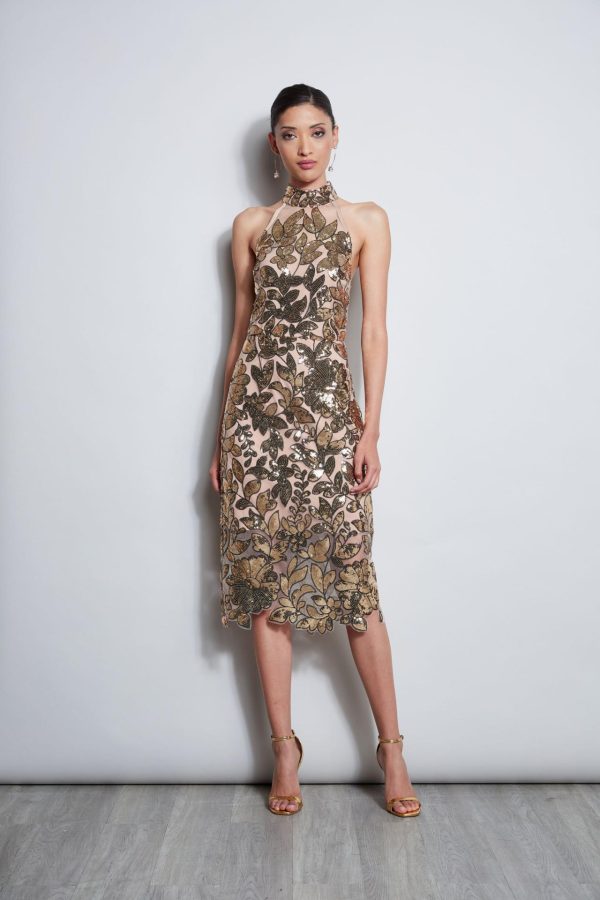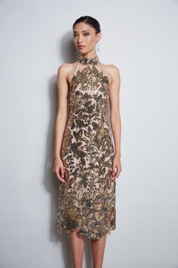 Strike a pose. All eyes will be on you the minute you walk into the room in this sequined floral midi dress. This party-perfect halter dress is designed in an intricate sequin mesh fabric that is partially lined to highlight the unique embroidery. The hem is hand-cut to follow the floral motif. This dress will work overtime in your closet – whether it’s for a special occasion, upcoming celebration or wedding.