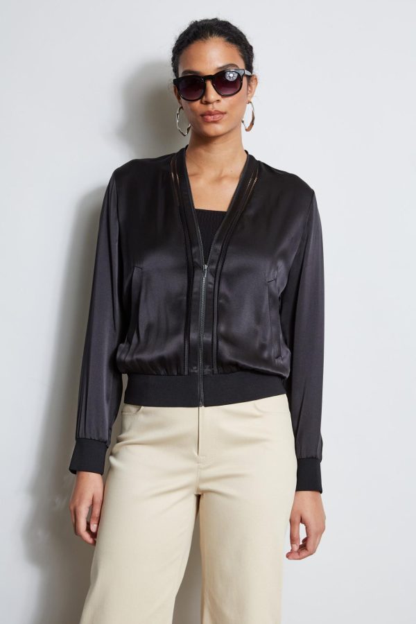 Silk satin takes a sporty detour in this chic bomber. Detailed with a zip front, knit trim & decorative embroidery stitching along the zip closure – dress it up or down with denim or your favorite pants.