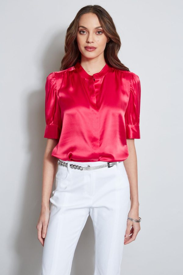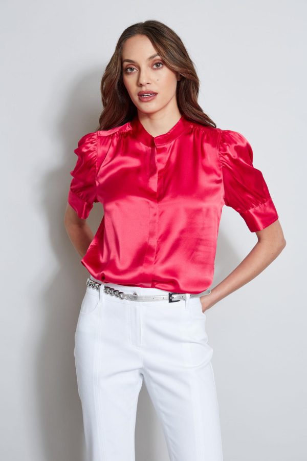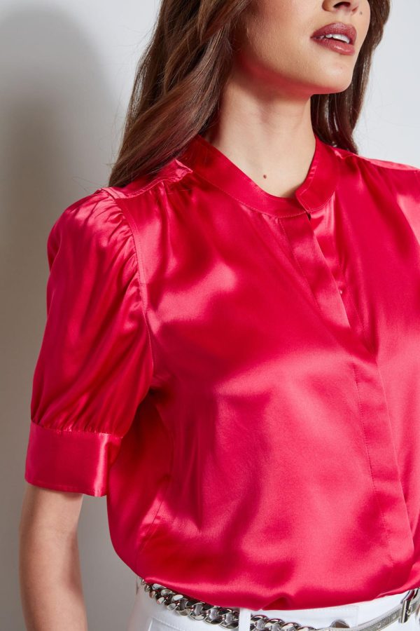 - Puff Ruched Short Sleeve Silk Satin Top with Band Collar & Button Down Silhouette