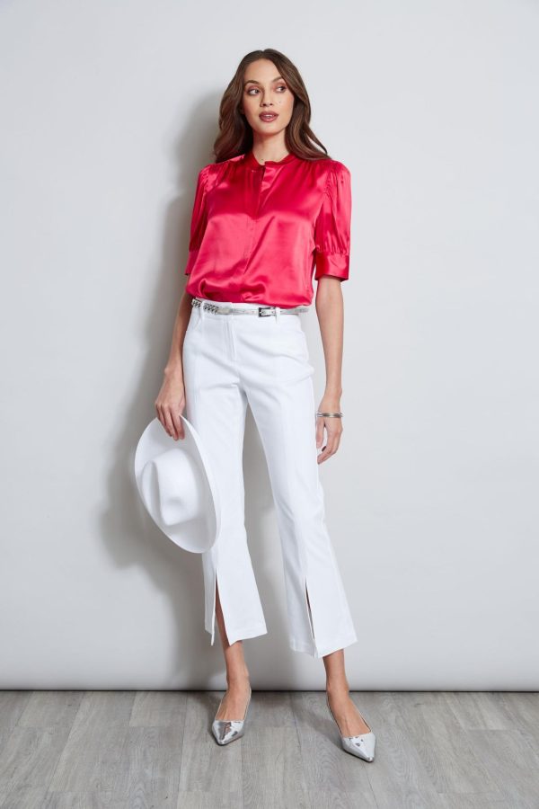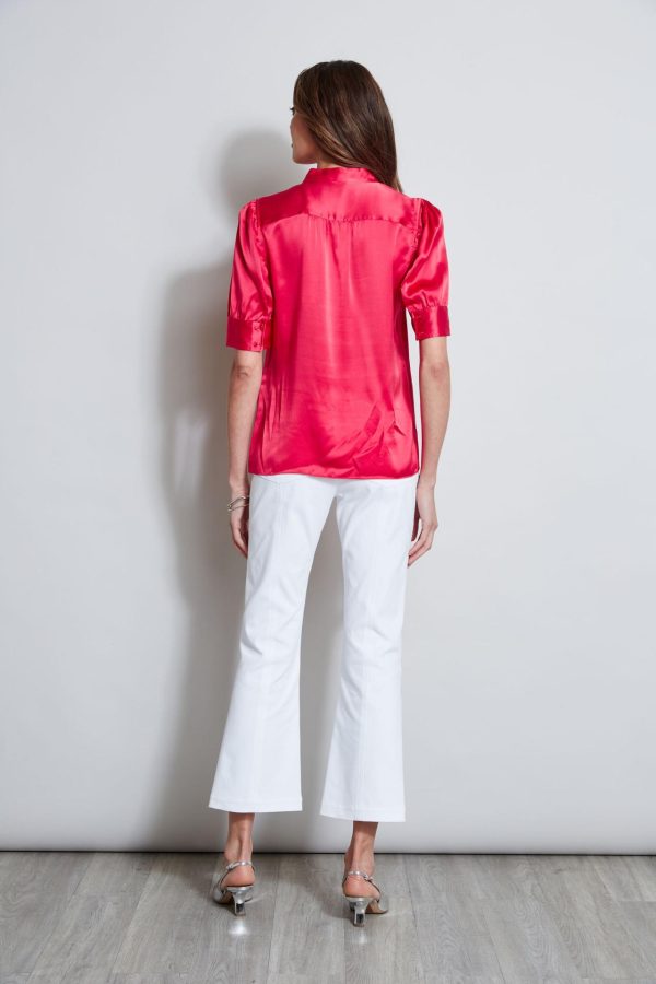 Meet Spring’s must have shirt. Silk Satin accents the femme vibe of our band collar shirt with ruched short sleeves. It is perfect for wearing on its own or layering with one of Elie’s standout blazer.