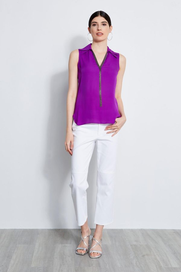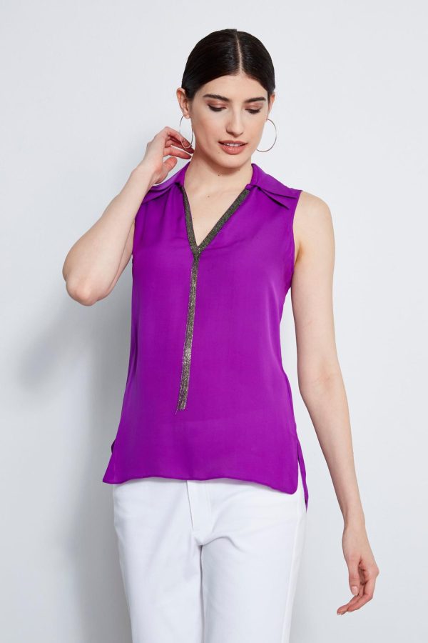 - Sleeveless Silk V-Neck Shirt with Chain Fringe Detail & Double Collar Neckline