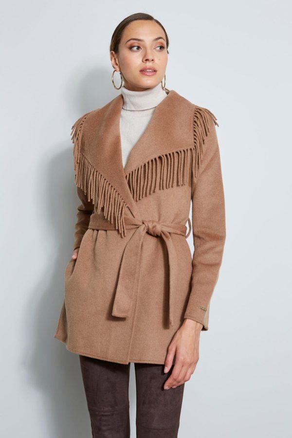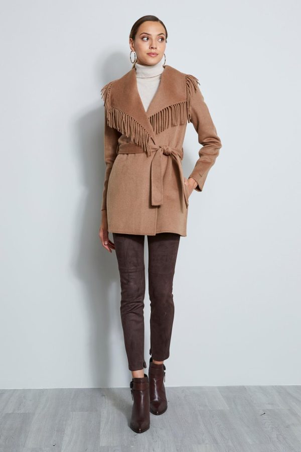 Get cozy in this sophisticated wrap coat in a Luxe Wool blend. Fringe trim borders the dramatic shawl collar & wrap front. Wear it with or without its matching sash to envelope you all season long.