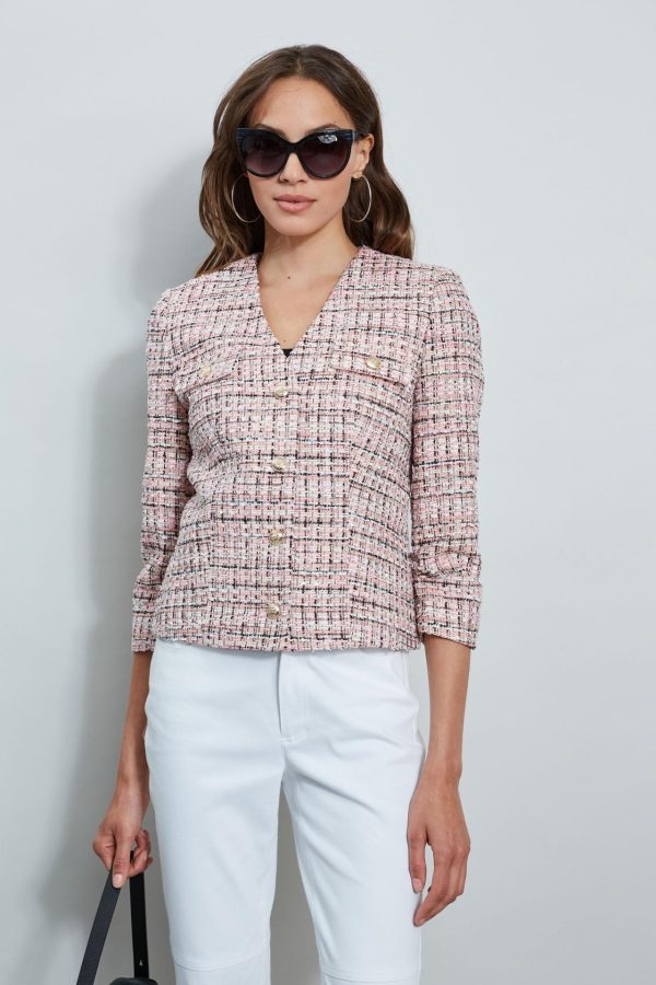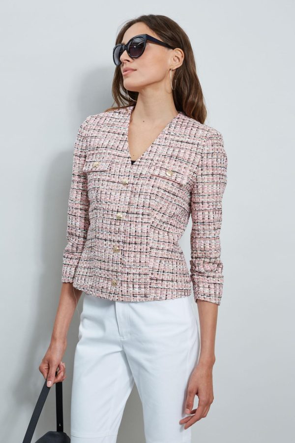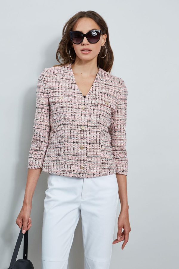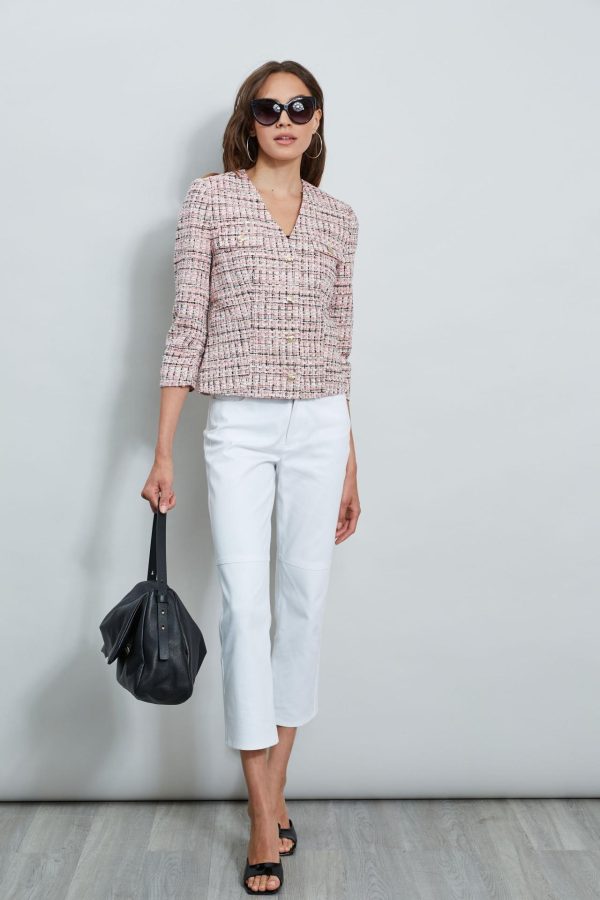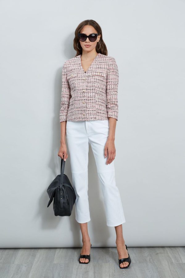 Our novelty tweed jacket has a modern vibe with its slightly cropped silhouette, crest button closure & V-neckline. Rich in texture, our lined tweed jacket features chest button flap pockets & three-quarter sleeves. Great with white or over a dress – this jacket speaks Summer.