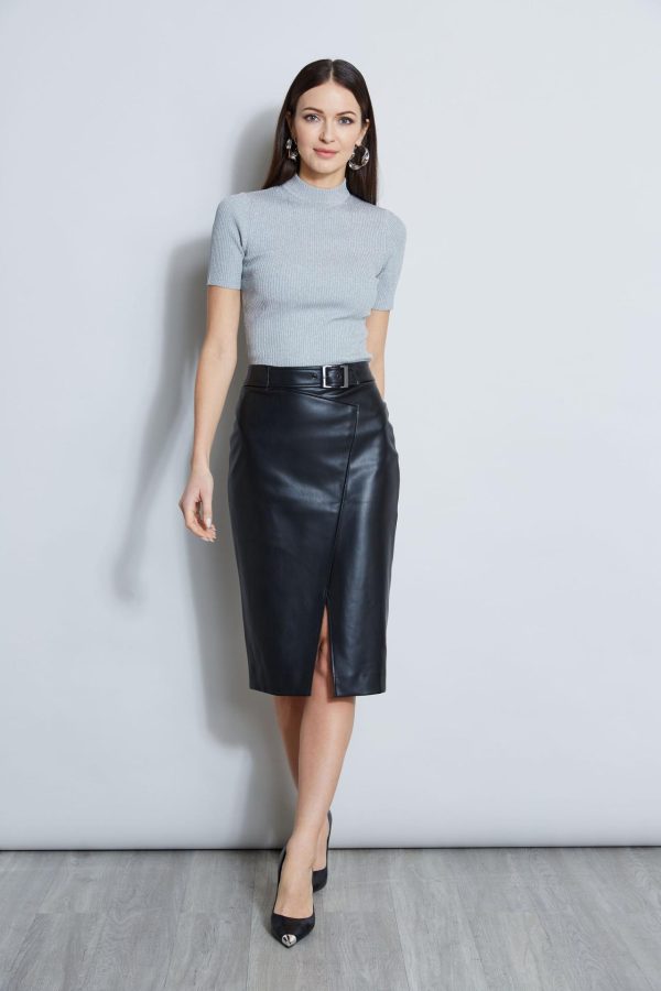 Elie loves the cool factor of our Vegan Leather Pencil Skirt. Crafted in soft-touch vegan leather, it features an ultra-flattering faux wrap silhouette and graphic buckle detail. Decidedly chic, pair it with our knits and your favorite kitten heel or booties.