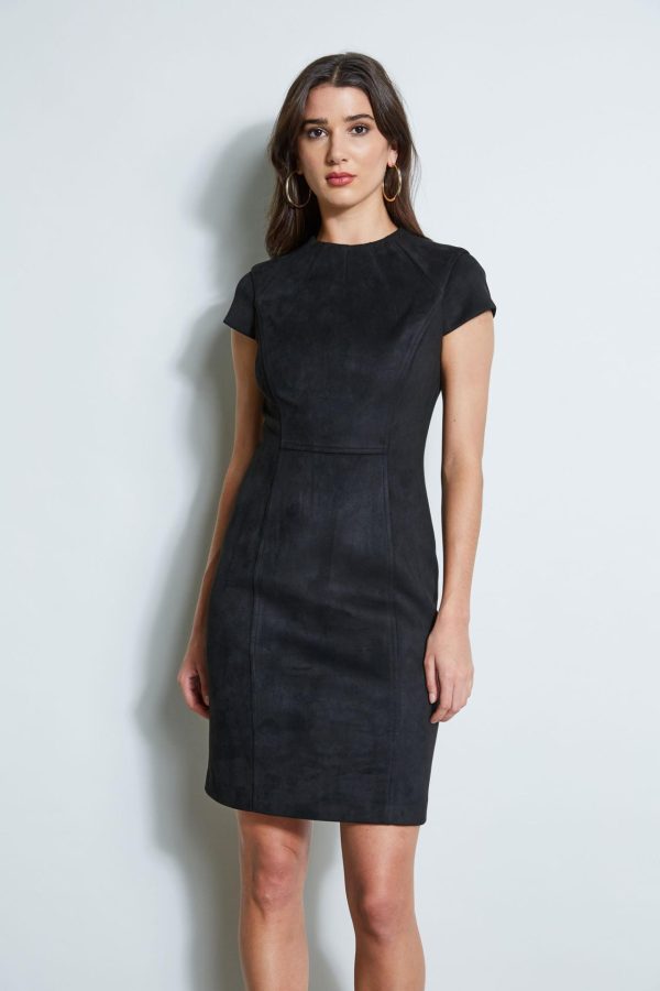 Our chic Vegan Suede Dart Dress will become your favorite go-to piece. Luxe Soft Touch Vegan Suede delivers this body skimming silhouette with its sculptured dart neckline & cap sleeve- perfect for desk to dinner.