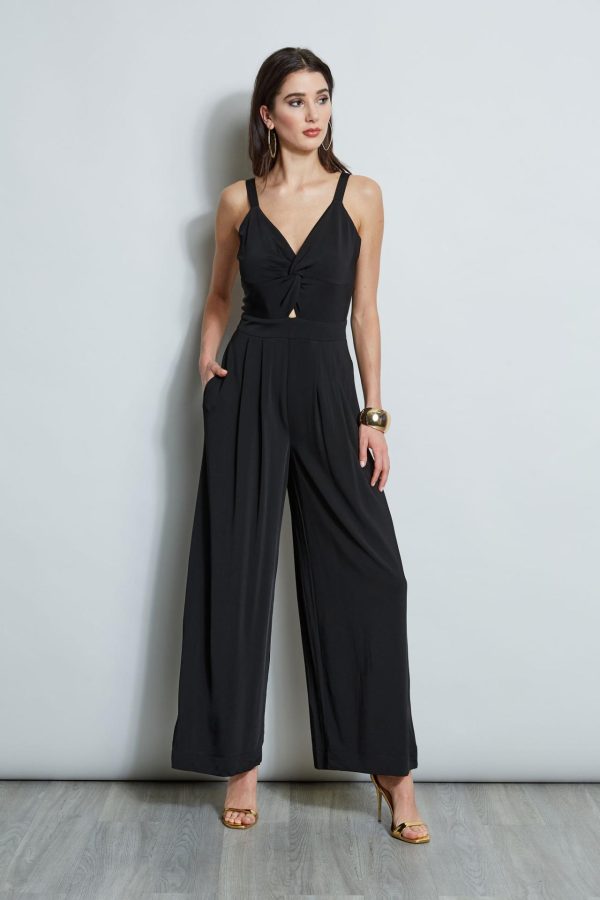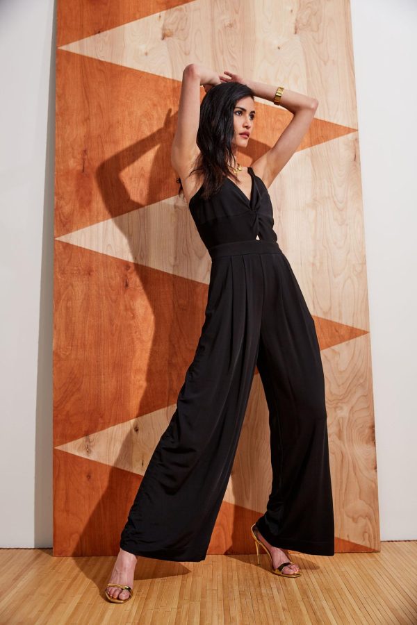 The twist neckline & discreet cutout midriff lends our Stretch Viscose Jumpsuit an edgy, sophisticated attitude. Detailed with a cinched waist & a flowy wide-leg silhouette, it is perfect for a night-out styled with a stiletto or strappy sandal.